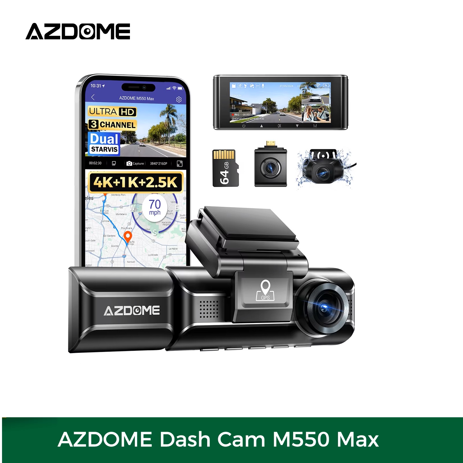 كاميرا Azdome M550 Max تعتبر واحدة من أقوى كاميرات القيادة ثلاثية القنوات، مصممة لتوفير تجربة مراقبة متكاملة أثناء القيادة والركن. تأتي بدقة تصل إلى 4K للكاميرا الأمامية و1K للخلفية و2.5K للداخلية، لتمنحك تسجيلًا واضحًا وشاملًا من جميع الزوايا.